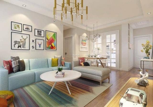 在整體色調(diào)上會使用黑白灰三種顏色為主調(diào),搭配些許的亮色來點綴空間,很少大面積使用鮮艷的色彩?,F(xiàn)代簡約軟裝設(shè)計適合用布藝來體現(xiàn),一般用幾何圖案或者簡樸大方的線條圖案等,地毯選擇一色的或者帶有幾何圖案的色塊比較分明的來搭配,窗簾選擇一色或者帶有幾何圖案的就夠了?;蛘叽钆渖弦恍┥拭骺斓难b飾畫,可以對整個空間起到一個畫龍點睛的效果。