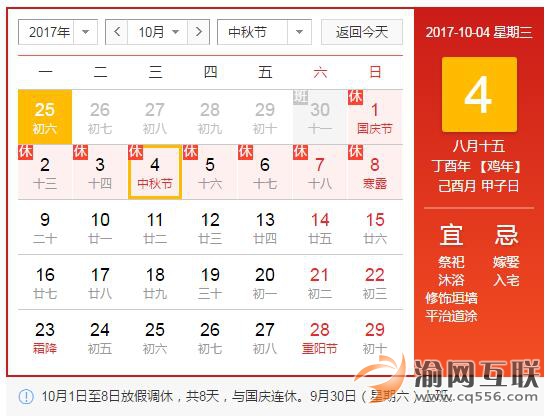 2017年中秋節(jié)、國(guó)慶節(jié)放假安排:9月30日(星期六)上班。10月1日至8日放假調(diào)休,共8天。10月9日正常上班。