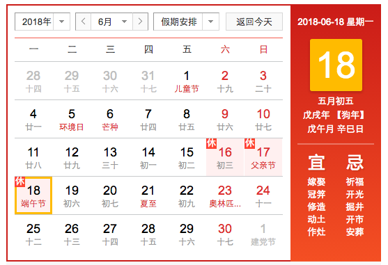 6月18日(星期一,農(nóng)歷端午節(jié)當(dāng)日)為國家法定節(jié)假日。
