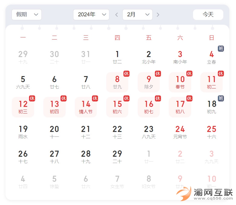 2024年2月8日 (星期四)中午至2月17日(星期六)),放假時間為10天。2月4日(星期天)、2月18日星期天為調(diào)休時間重慶公司正常上班。