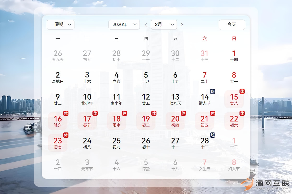 2月15日(農(nóng)歷臘月二十八、周日)至23日(農(nóng)歷正月初七、周一)放假調(diào)休,共9天。2月14日(周六)、2月28日(周六)上班。