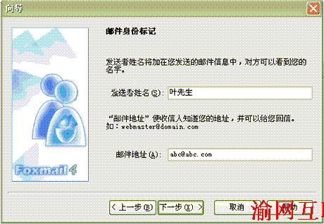 4.點擊下一步彈出以下窗口,填寫發(fā)送者姓名(如張先生)及郵箱地址(如:abc@abc.com)
