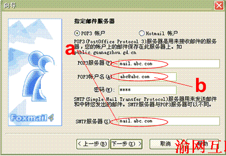 5.點擊下一步彈出以下窗口,在a處填入"mail.abc.com",在b處填入您的整個郵箱地址