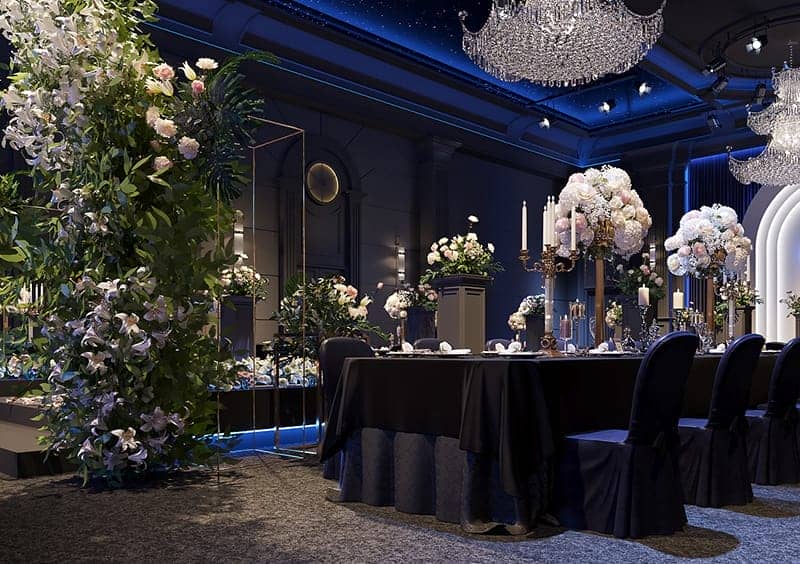 會(huì)場(chǎng)大廳的裝修設(shè)計(jì)會(huì)帶給賓客強(qiáng)烈的氛圍感受,過高的天頂適合那些人數(shù)較多,場(chǎng)面較大的婚禮。較低的天頂只適合那些人數(shù)較少、溫馨的小型婚禮。