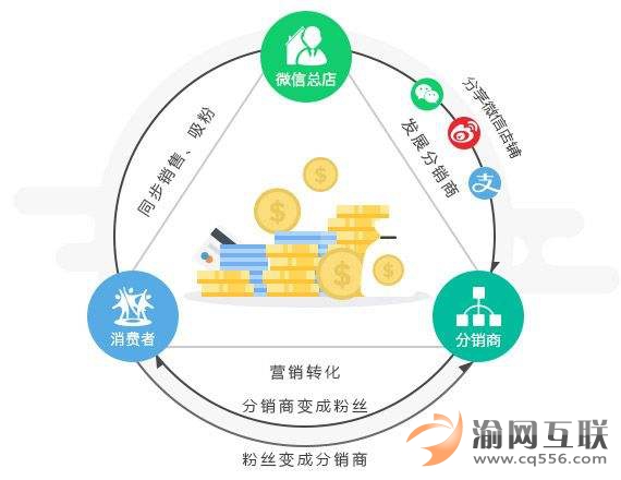 生產(chǎn)廠商或品牌公司基于公司微信服務(wù)號上部署微分銷商城,員工和經(jīng)銷商在公司的微信分銷商城基礎(chǔ)上生成專屬于自己的一個分銷商城(員工與經(jīng)銷商即二級分銷商),員工的朋友或者經(jīng)銷商的客戶在員工或經(jīng)銷商的個人微信商城基礎(chǔ)上再次生成個人分銷商城(朋友與客戶即三級分銷商),從而實現(xiàn)公司零成本泛員工業(yè)態(tài)。